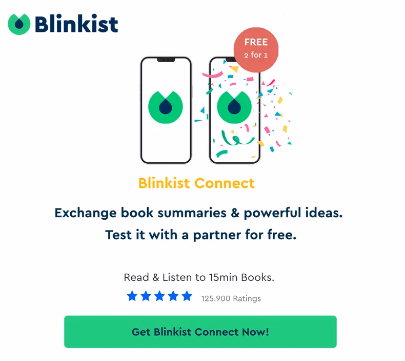 Blinkist is a subscription-based service that offers condensed versions of non-fiction books as brief summaries or "blinks." These summaries are typically about 15 minutes long and are designed to provide users with the key ideas and takeaways from a book in a condensed format. The service offers various titles across various categories, including business, self-improvement, and psychology. Users can access the summaries on their phones or tablet through the Blinkist app or on the web through the Blinkist website. The service is intended to help users stay up to date with the latest ideas and trends in their field or learn more about a particular topic without having to commit to reading an entire book.