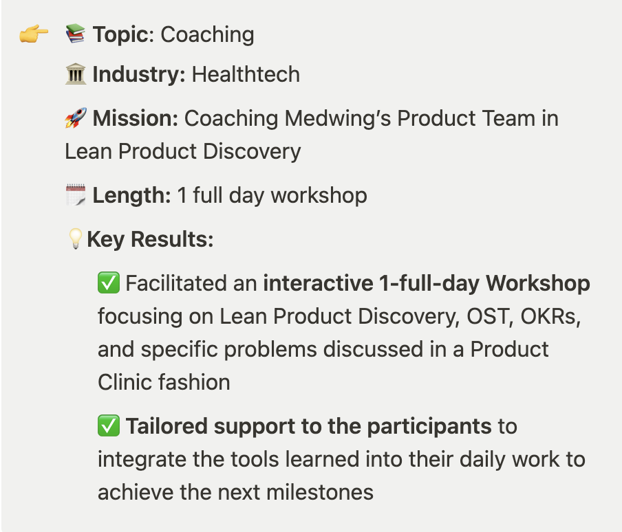 💡 The workshop's impact extended beyond the immediate team to influence Medwing's broader strategic approach, as the alignment of product goals with business objectives became more streamlined and effective.
