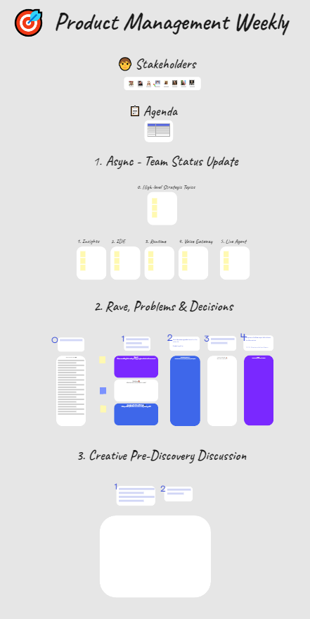 - Creative Weekly Product Team meetings: we proposed a new template (powered by Miro) to foster creativity and collaboration during regular meetings. The status updates are to be collected async in the board, and the sync time is to be used to discuss product challenges and brainstorm on cool initiatives to start!