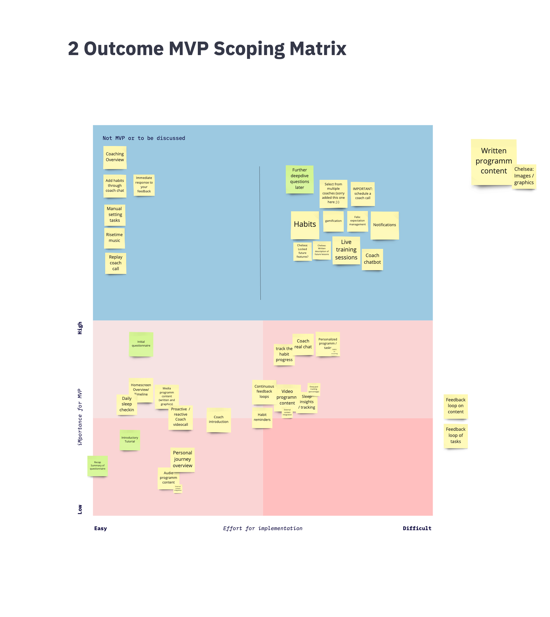 For the Hypotheses behind each feature, we did an exercise to cluster hypotheses and filtered what to test and what not. And for deciding what to include in the MVP, we used the Matrix User Importance Vs. Effort of implementation.