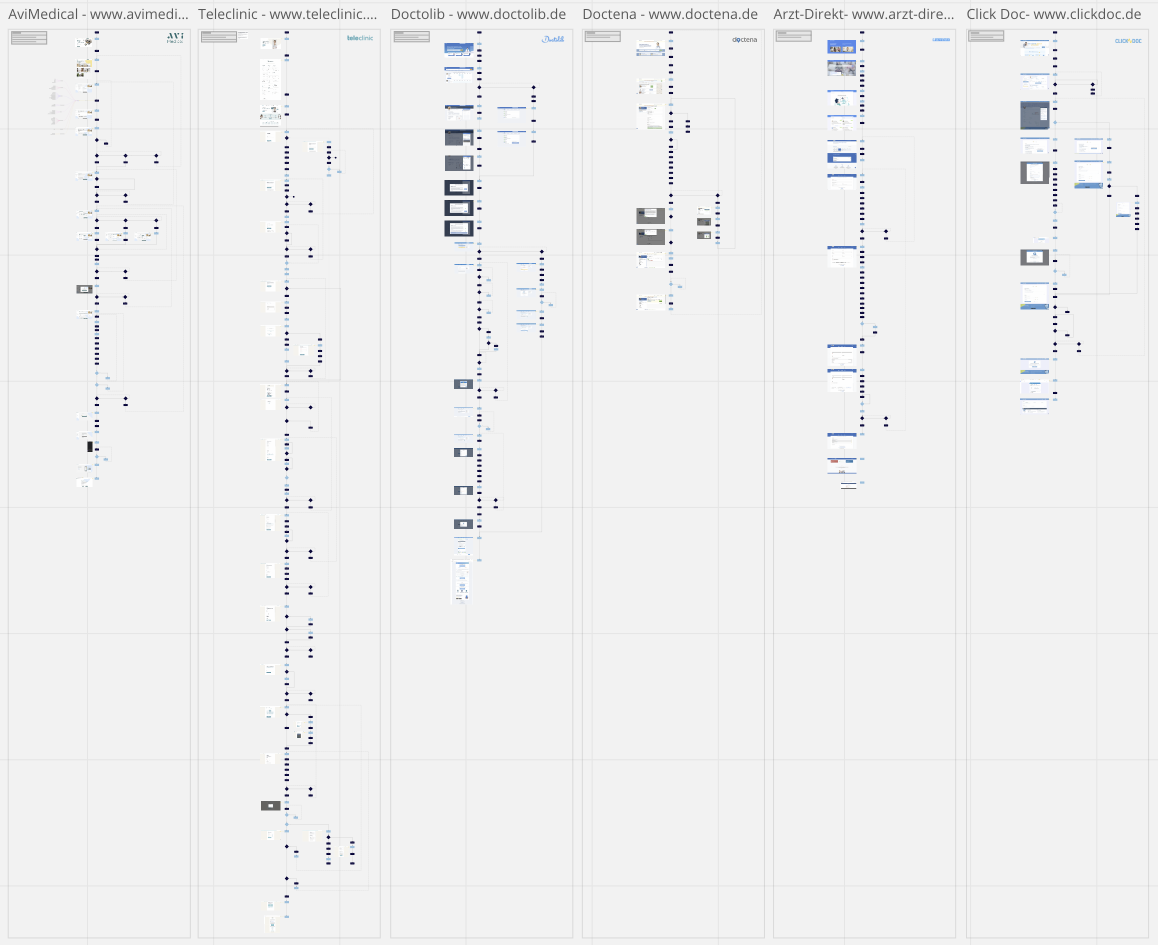 In order to design thoughtful experiences efficiently, we decided to look at the HealthTech landscape to better understand what our competitors were doing. We mapped out the appointment booking flow for 6 competitors and the health profile page for 4 competitors.