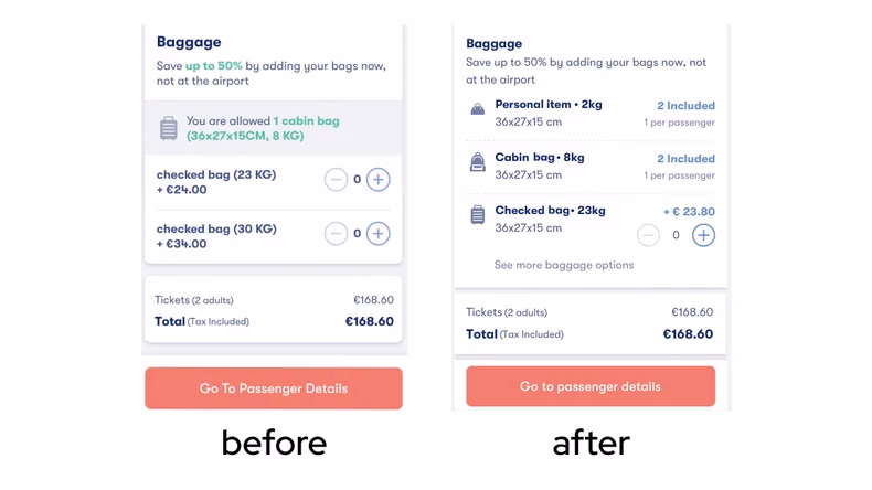 💡 Increased the baggage attachment rate (upsell) and decreased Customer Support touchpoints ("What baggage am I allowed to take?") through enhancing baggage details (added personal item and cabin bag differentiation as many low-cost carriers claim they allow one cabin bag but then limit that size to a small bag or backpack, which was upsetting for customers) and better visual communication.