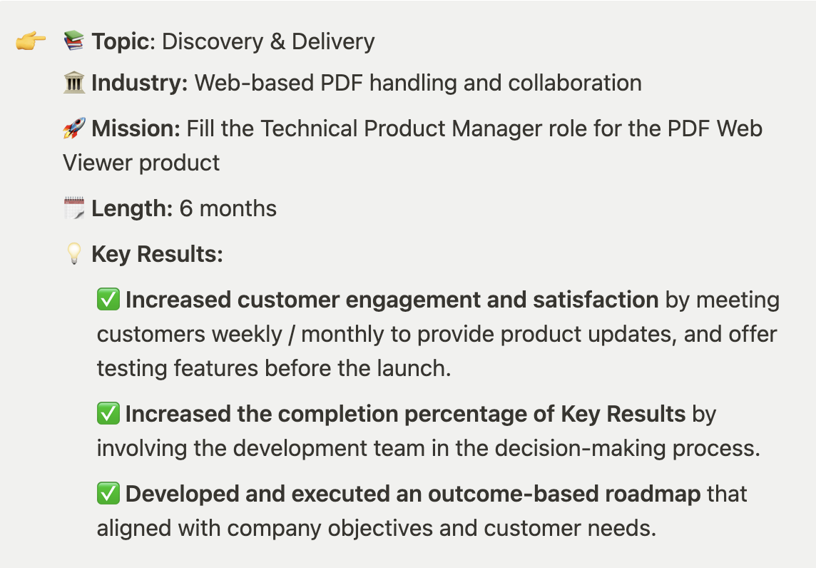 Before we joined the company, the company started working with the OKR framework. We needed to define quarterly objectives and key results for our team. The team needed to adopt the OKR framework and ensure that team objectives were aligned with company strategy and actionable.