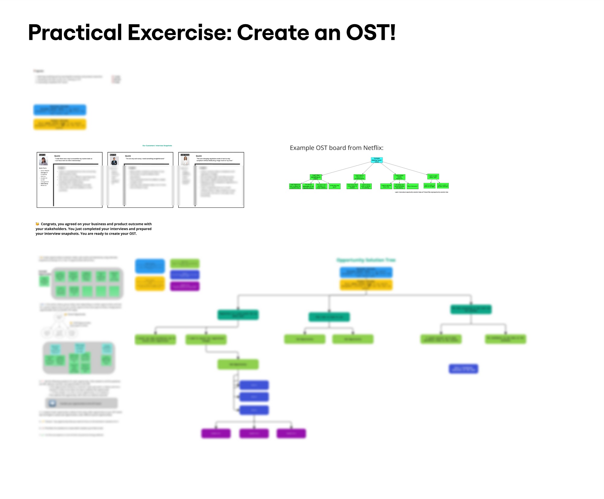 This session introduced the concept of continuous discovery and showed how to break down high-level goals into problem spaces and hypotheses using Opportunity Solution Trees (OSTs). Participants worked through real product examples to practice mapping their current requests into opportunity-driven framing.