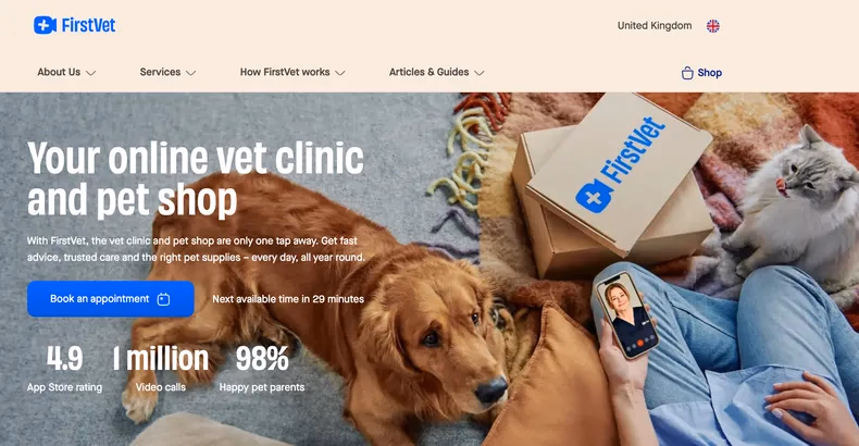FirstVet is a digital veterinary service provider that allows pet owners to consult with licensed veterinarians remotely through a video call service. The company provides an online platform where pet owners can book a video call with a veterinarian to receive advice and guidance on their pet's health and well-being. The service is available 24/7 and can be accessed from anywhere, making it convenient for pet owners to get professional help without leaving their homes.